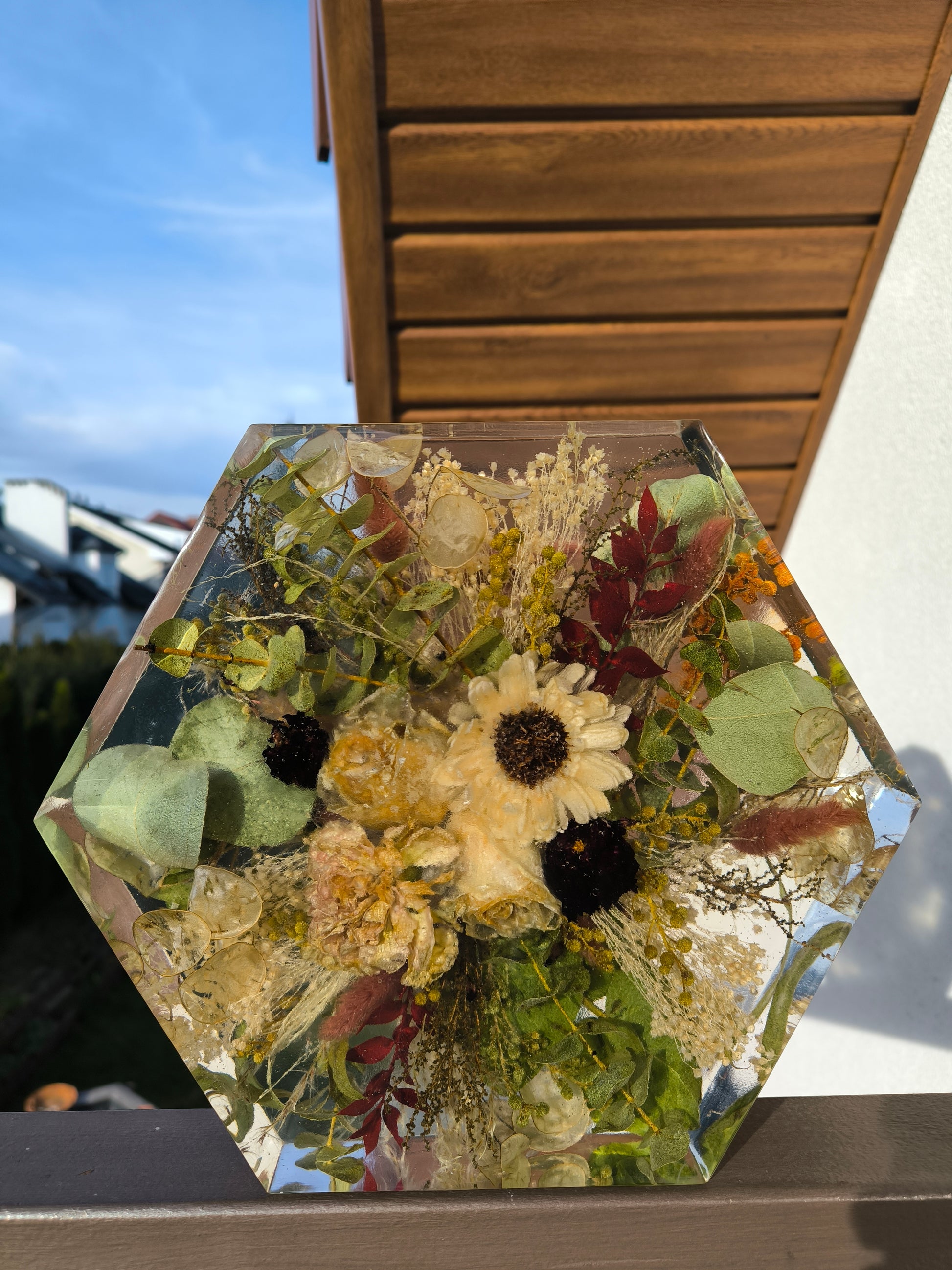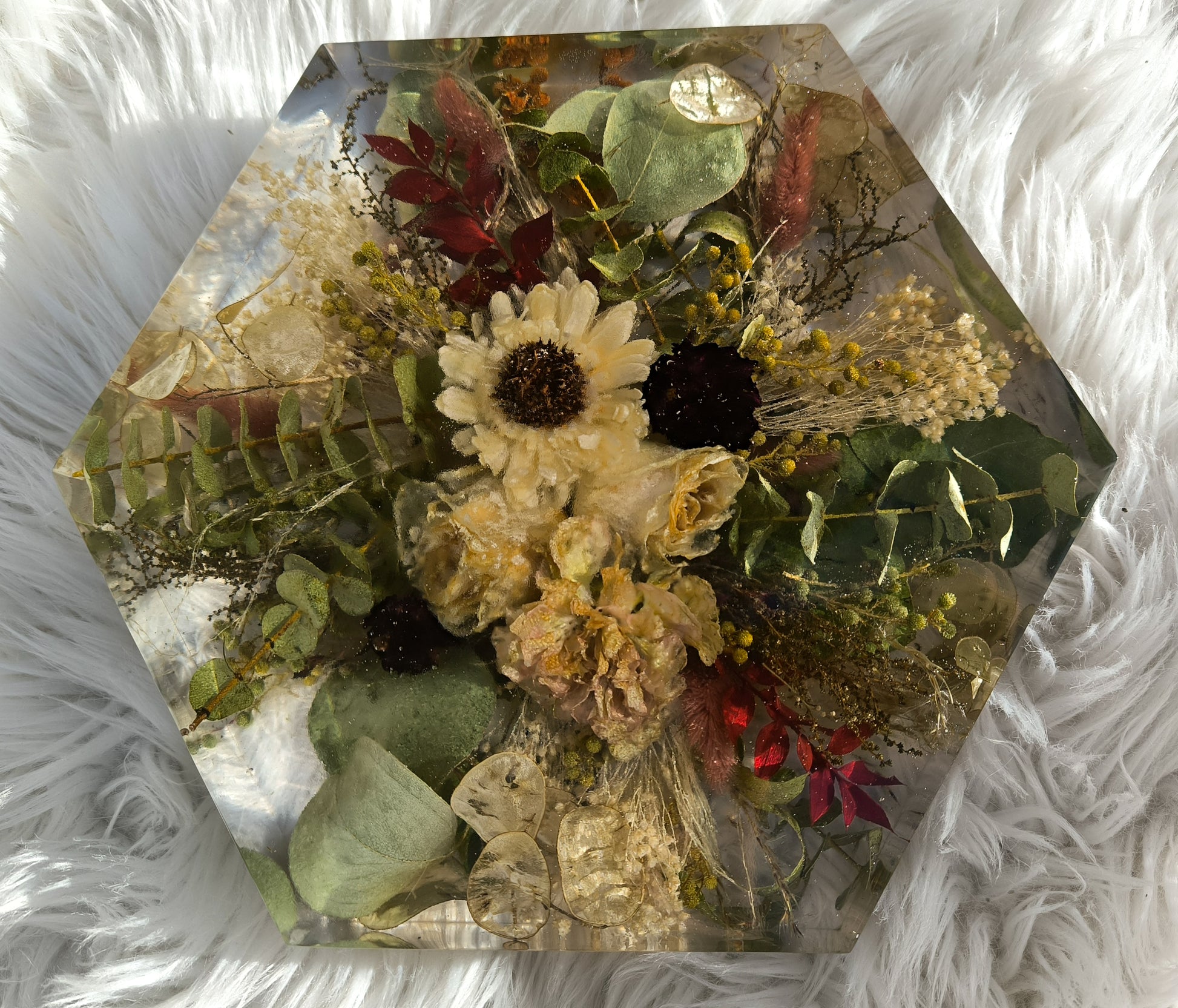 Twój ślub to jeden z najpiękniejszych dni w życiu. Dlaczego nie zachować jego magii na zawsze? Zalewamy bukiety ślubne w trwałej, krystalicznej żywicy, tworząc niezwykłe, personalizowane pamiątki w formie heksagonu L.