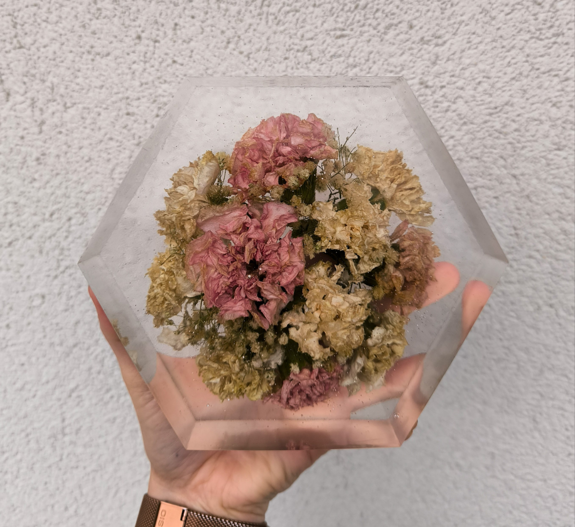 Twój ślub to jeden z najpiękniejszych dni w życiu. Dlaczego nie zachować jego magii na zawsze? Zalewamy bukiety ślubne w trwałej, krystalicznej żywicy, tworząc niezwykłe, personalizowane pamiątki w formie heksagonu S.
