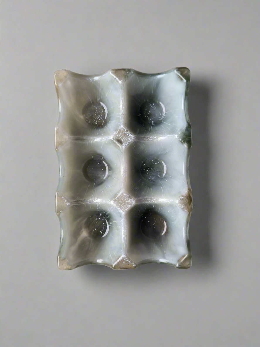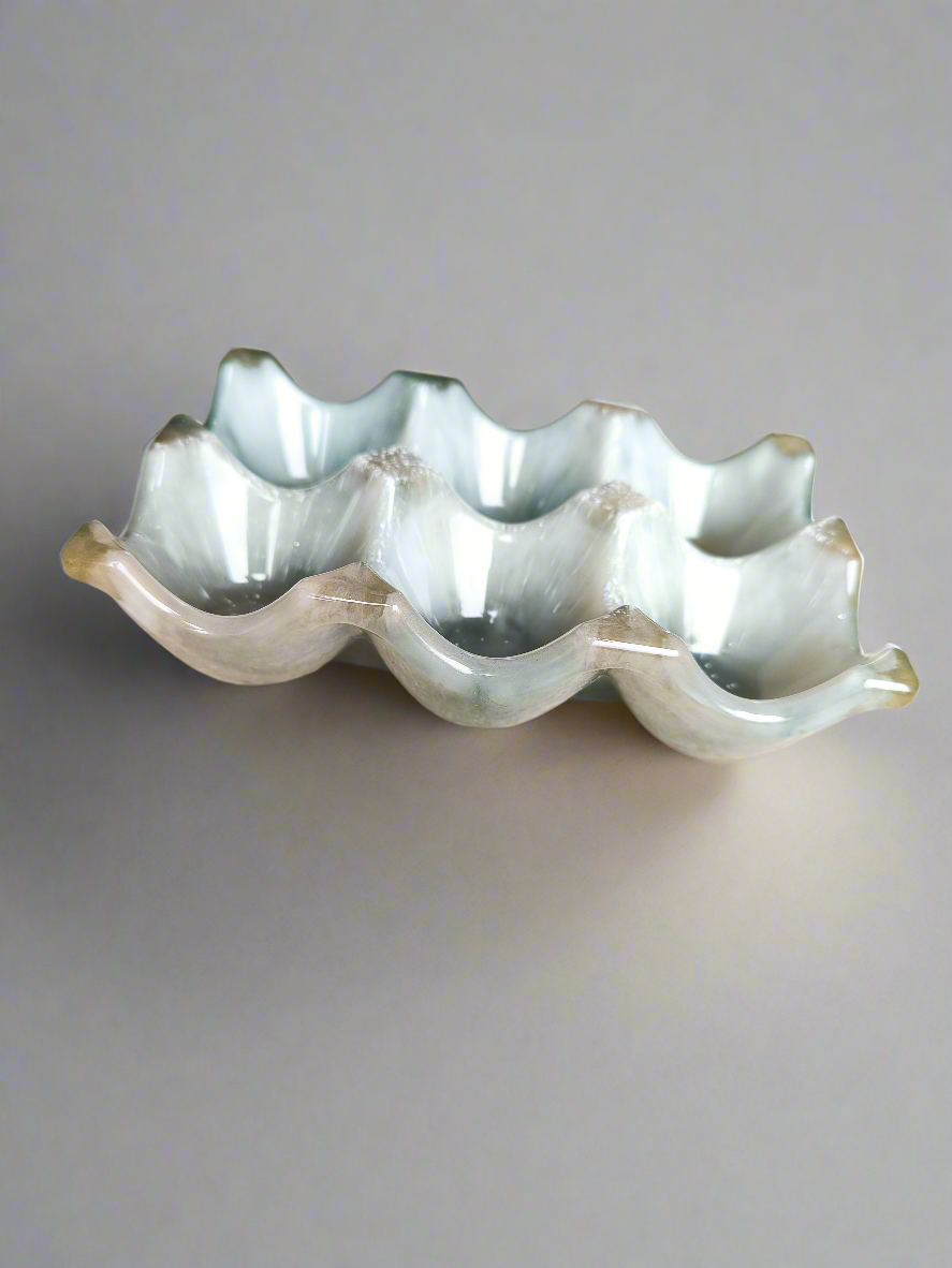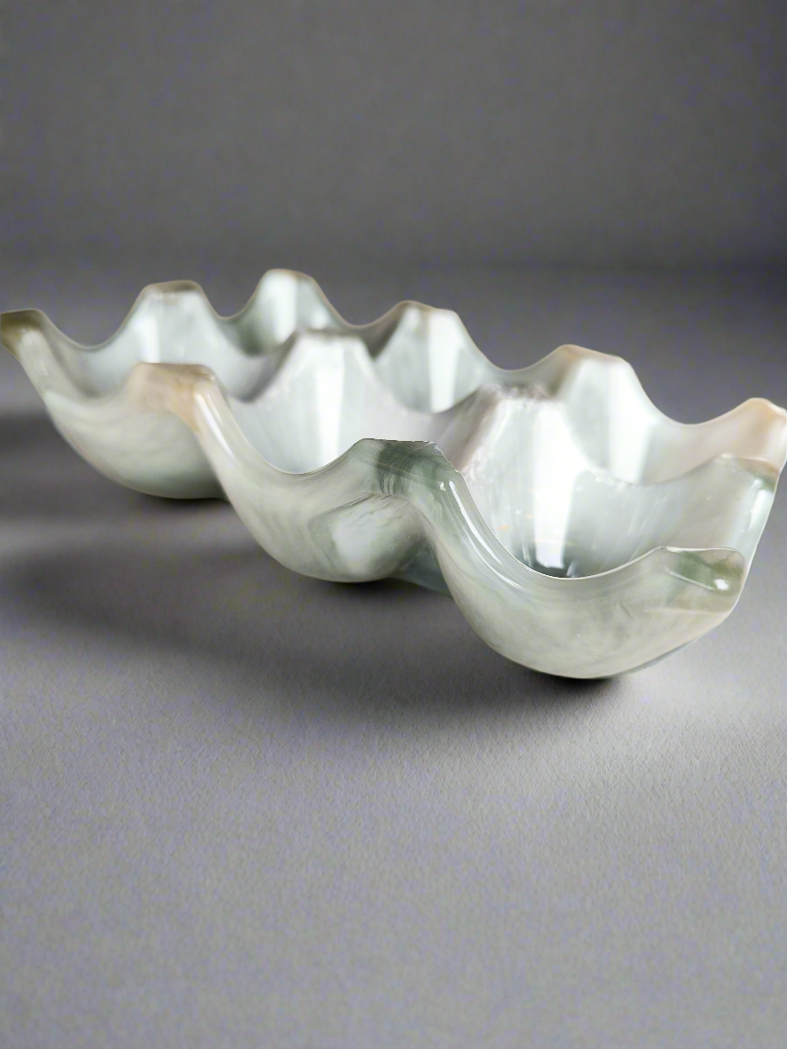 Ten unikalny stojak na jajka łączy w sobie styl i praktyczność. Wykonany ręcznie z wysokiej jakości żywicy epoksydowej, zachwyca eleganckim, perłowym wykończeniem i organicznym kształtem inspirowanym naturą. Jego nowoczesny design doskonale komponuje się zarówno z klasycznymi, jak i nowoczesnymi wnętrzami.