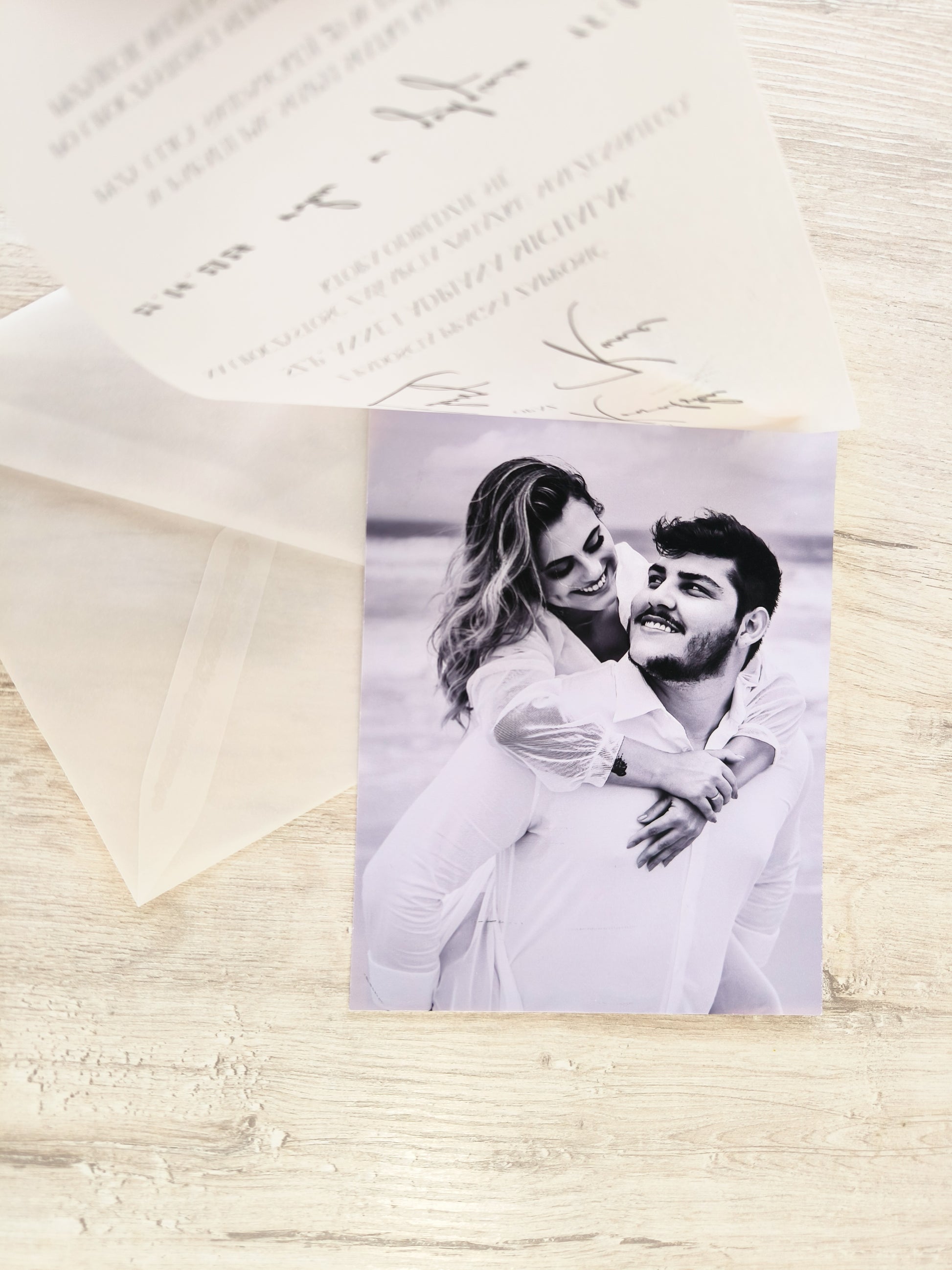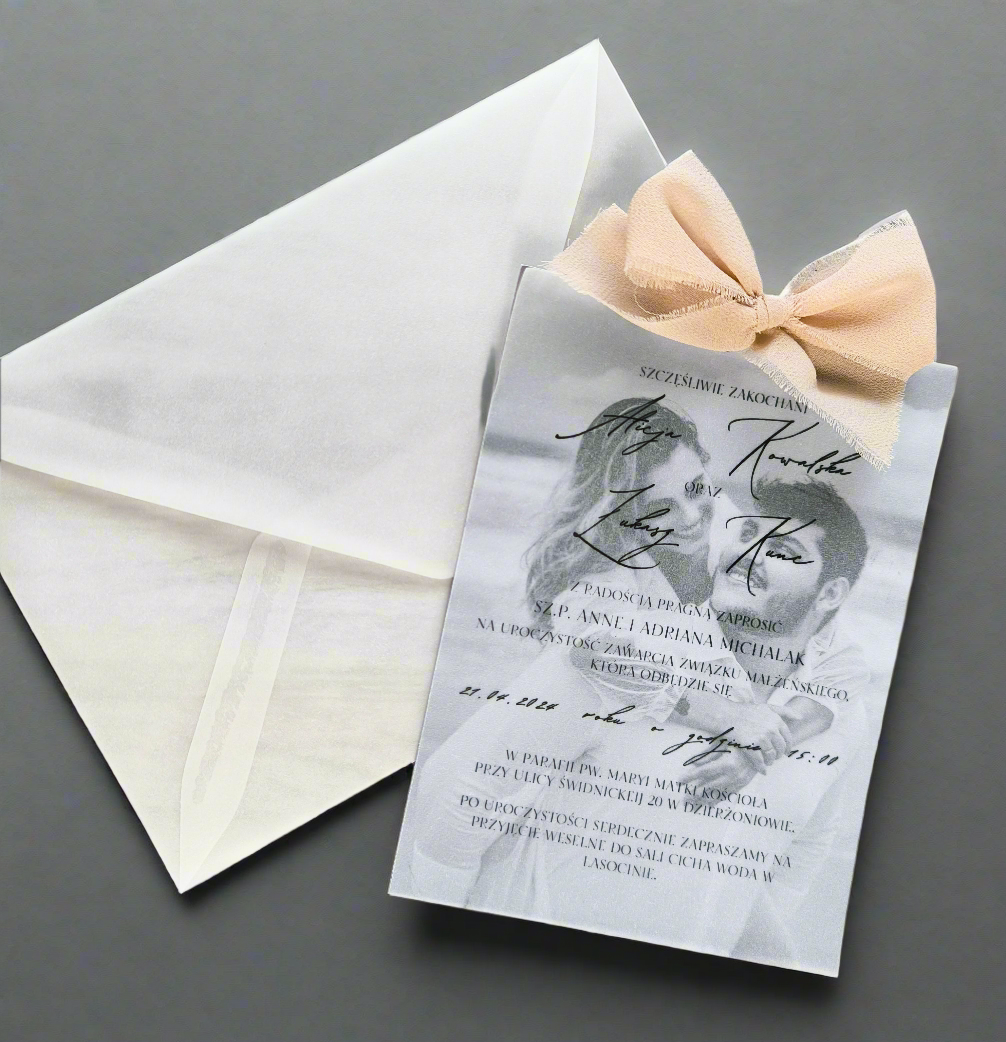 - Główne zaproszenie – zaproszenie wykonane na przezroczystym papierze, który uwydatnia Wasze zdjęcie znajdujące się pod głównym zaproszeniem