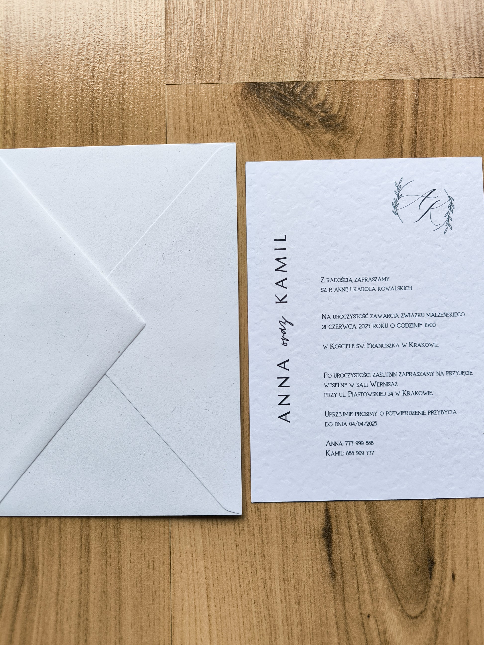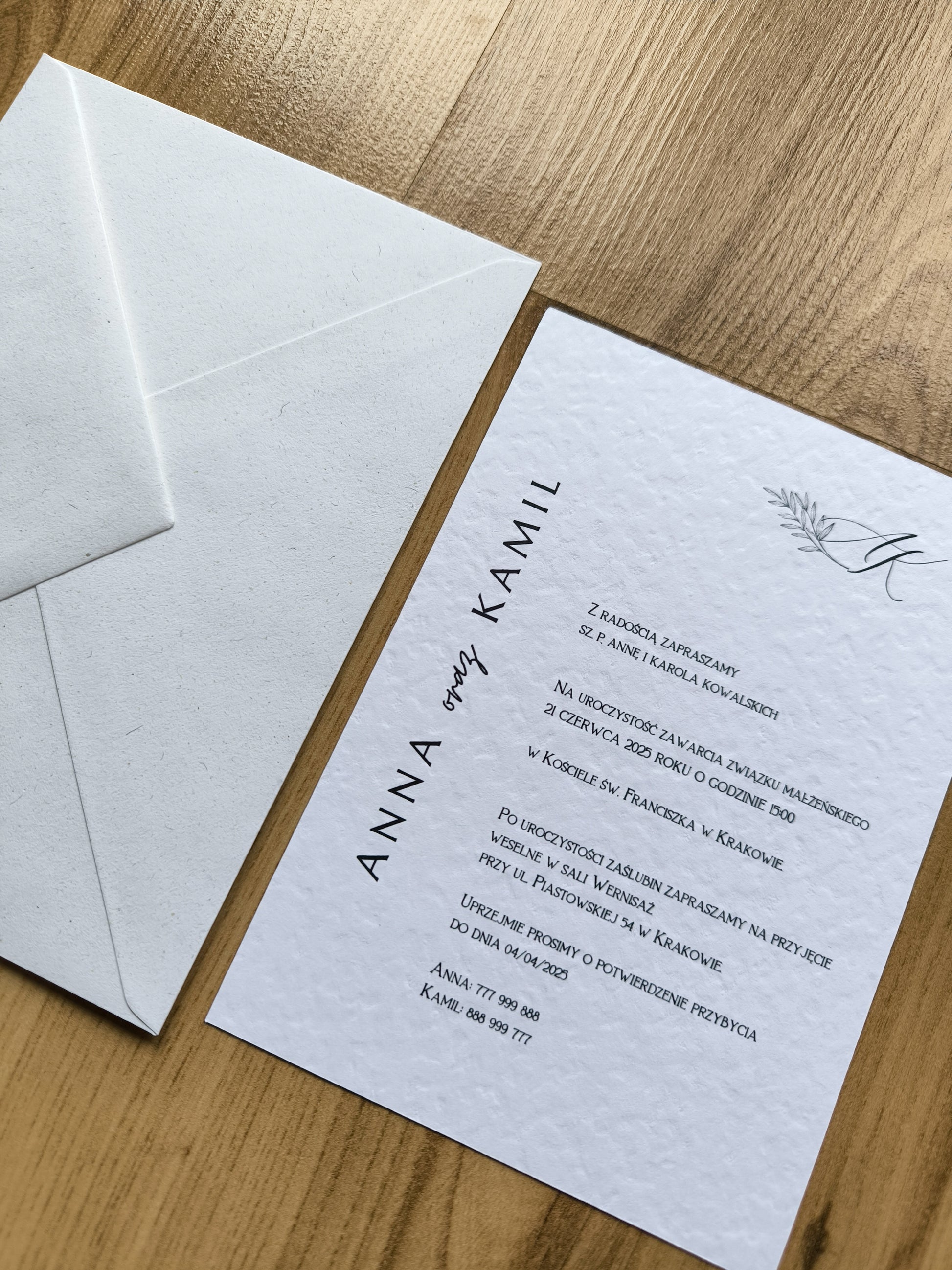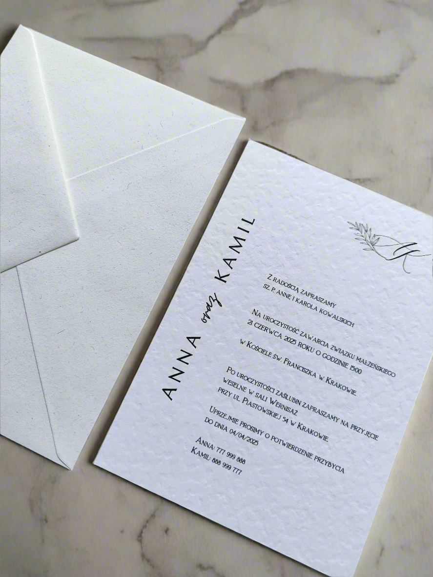 - Główne zaproszenie – jednokartkowe zaproszenie na papierze z delikatną strukturą z minimalistycznym designem.