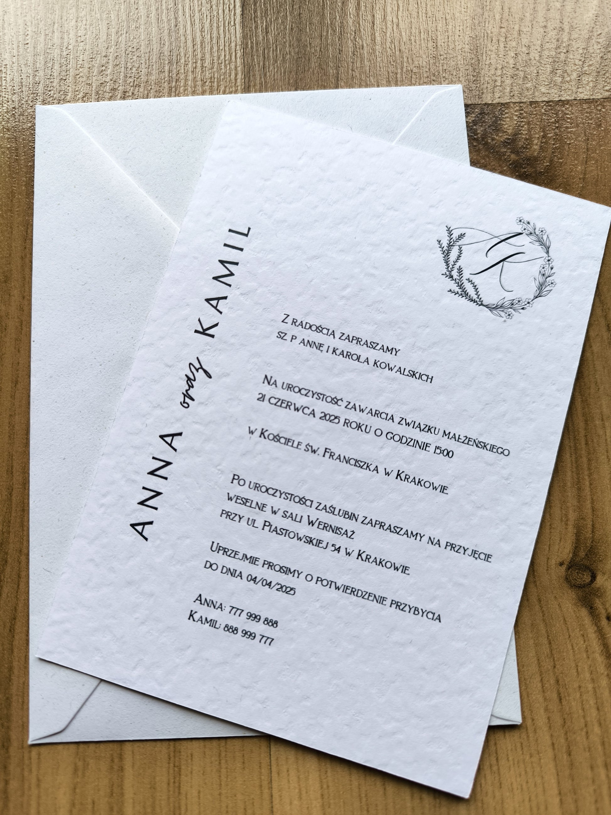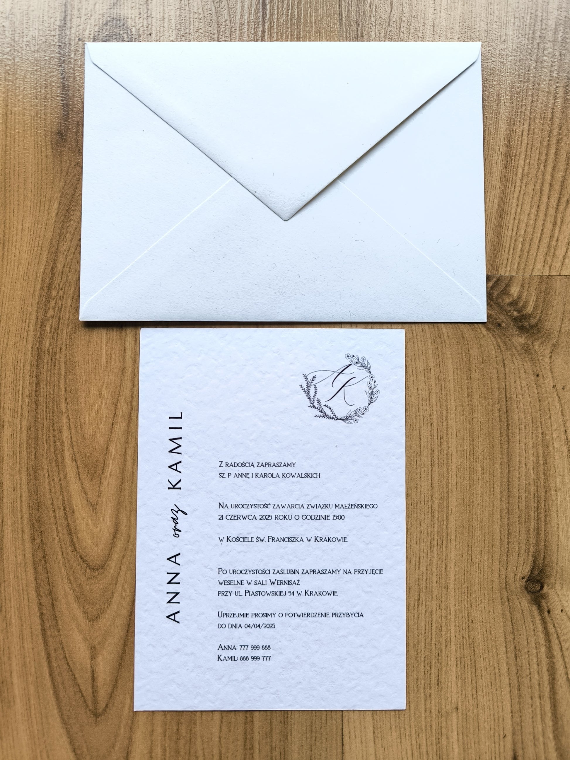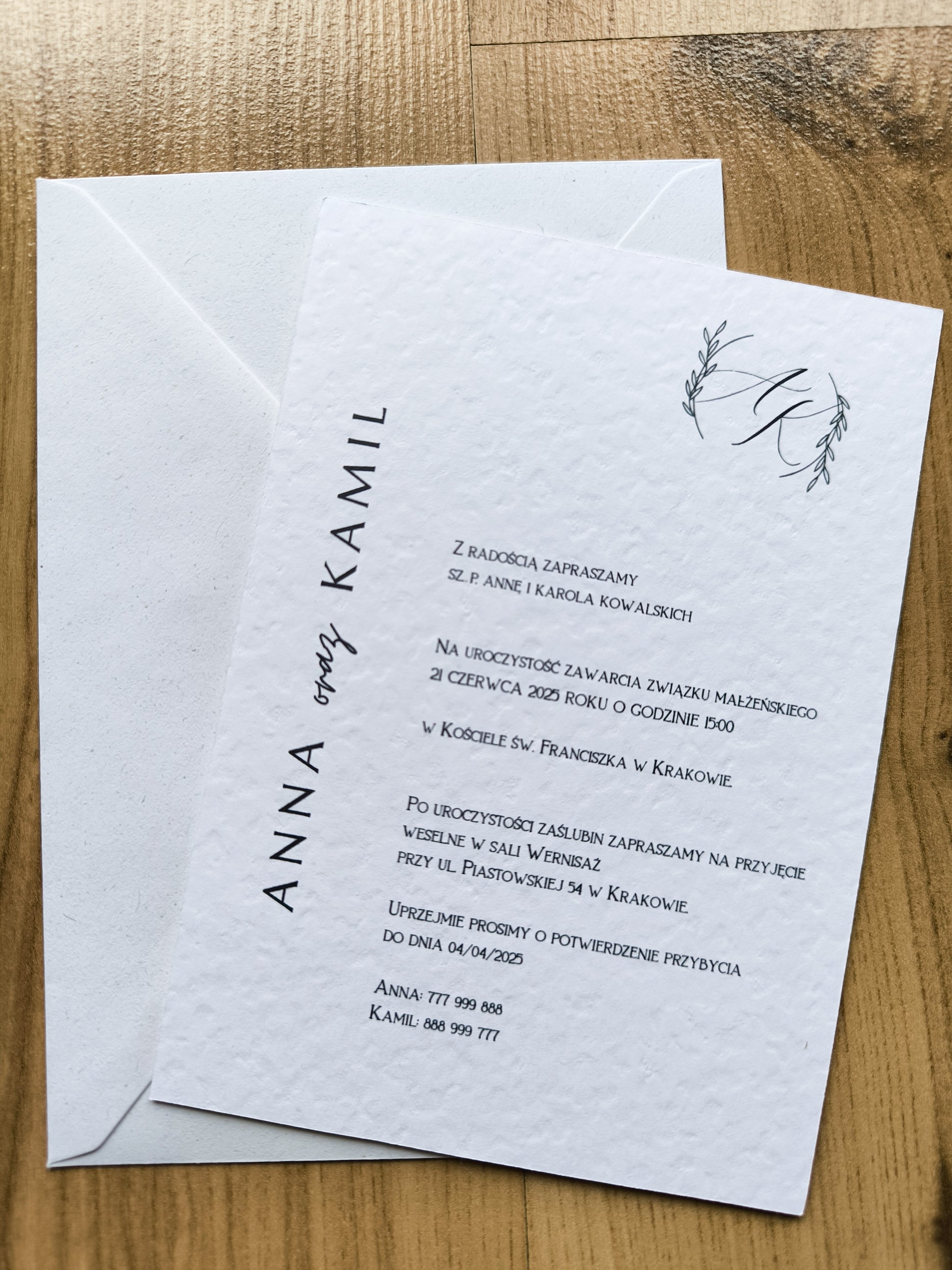 - Główne zaproszenie – jednokartkowe zaproszenie na papierze z delikatną strukturą z minimalistycznym designem.